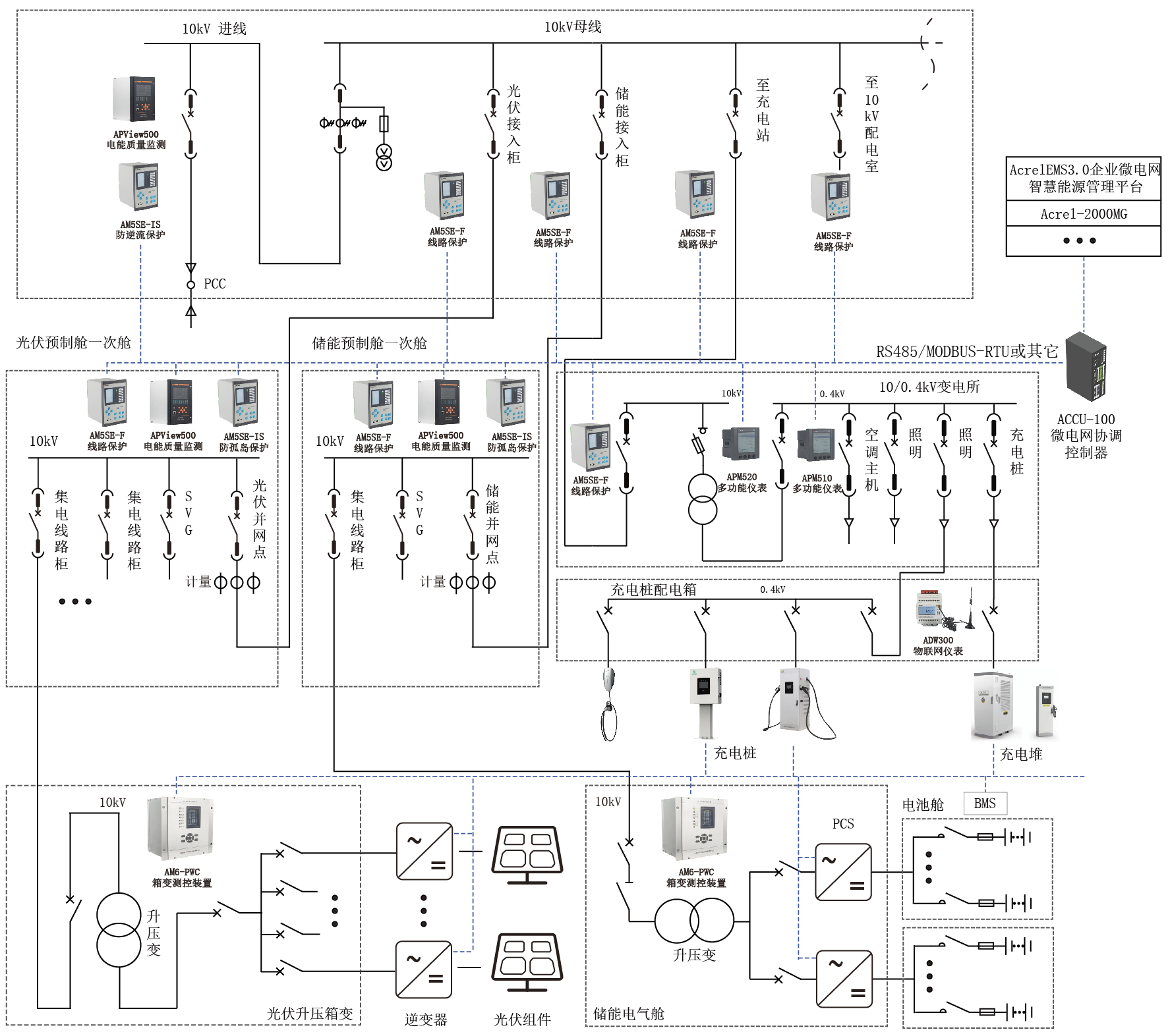 安科瑞为新能源工程包括分布式光伏、储能、充电站提供软硬件一体化解决方案,图2为一个包含分布式光伏、储能、汽车充电站和传统用电负荷组成的新型10kV配电网,由10kV开闭所、10kV并网分布式光伏系统、10kV并网储能系统、电动汽车充电站以及其它负荷组成。安科瑞提供的解决方案包括: