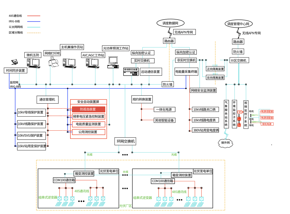 光伏监控系统需要使用相关保护、测控、稳控、分析及数据安全和通讯设备,典型的分布式光伏电站并网系统需要用到的二次设备如下表所示。