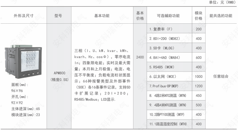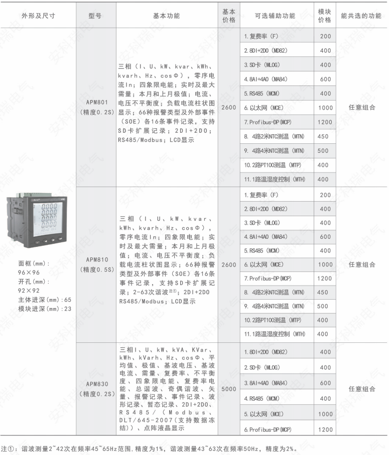APM系列网络电力仪表按IEC标准设计,具有全电量测量,电能统计,电能质量分析及网络通讯等功能,主要用于对电网供电质量的综合监控诊断及电能管理。该系列仪表采用了模块化设计,当客户需要增加开关量输入输出,模拟量输入输出,SD卡记录,以太网通讯时,只需在背部插入对应模块即可。