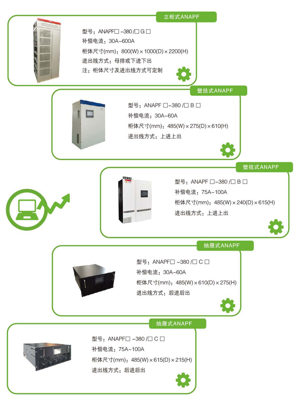 ANAPF系列有源电力滤波器通过电流互感器采集系统谐波电流,经控制器快速计算并提取各次谐波电流的含量,产生谐波电流指令,通过功率执行器件产生与谐波电流幅值相等方向相反的补偿电流,并注入电力系统中,从而抵消非线性负载所产生的谐波电流。
