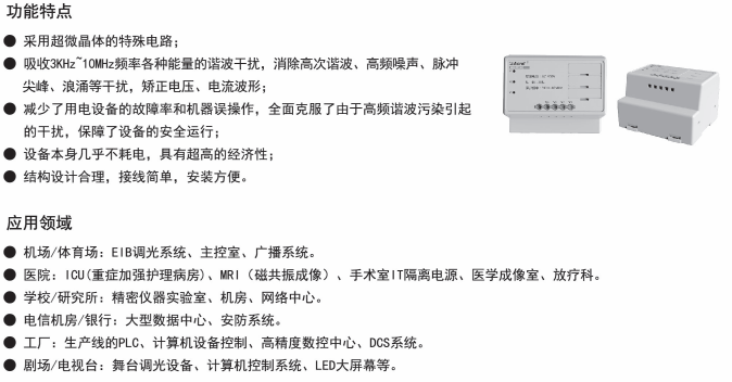 该系列谐波保护器对用电设备产生的随机高次谐波、脉冲尖峰、电涌等具有抑制和吸收作用,能有效滤除电压尖峰杂波、矫正畸变的电压波形、对谐波噪声进行消化和吸收、防止保护装置误跳闸、保证用电设备正常运行。
