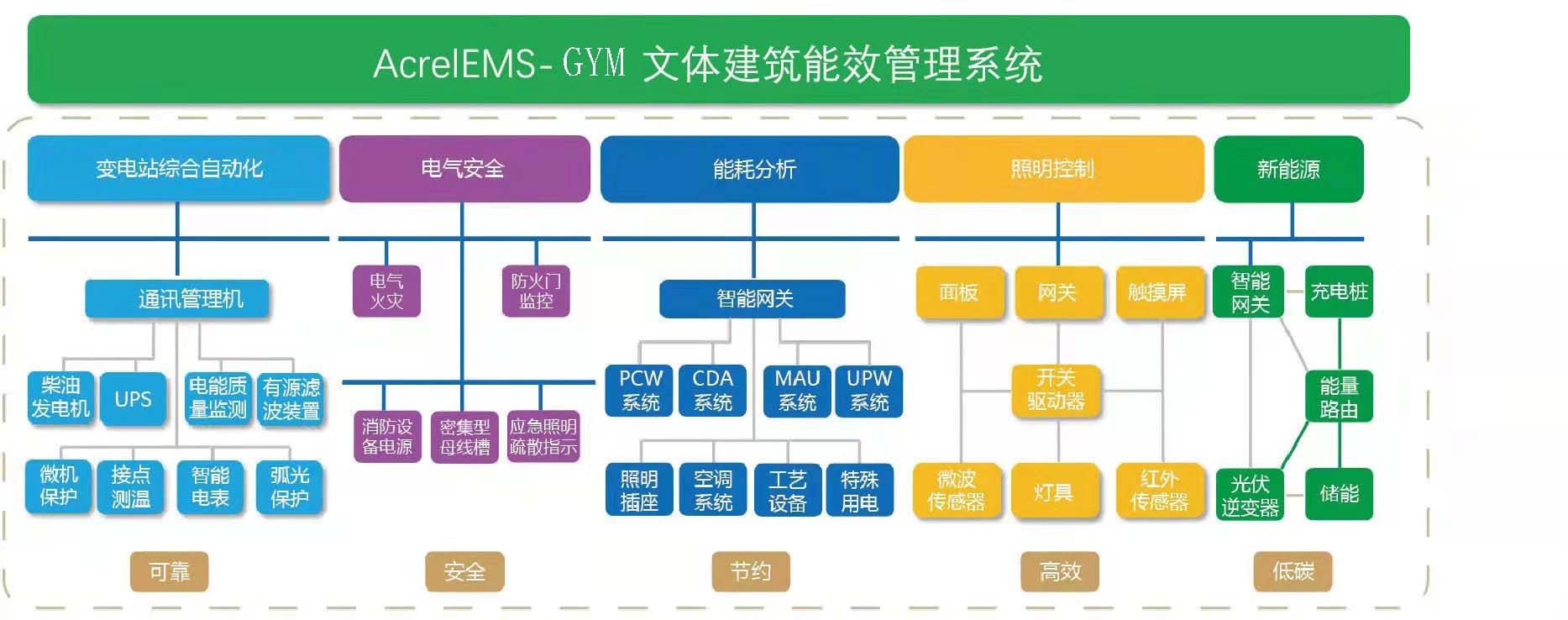 AcrelEMS-CA 文体建筑能效管理聚焦建筑的能量和信息的流向搭建平台解决方案。该系统解决方案集变电站综合自动化、电力监控、电能质量分析及治理、电气安全、能耗分析、照明控制、设备运维于一体。打破子系统孤立,配置方便,运维便捷;多套子系统融合为一,布设成本降低。