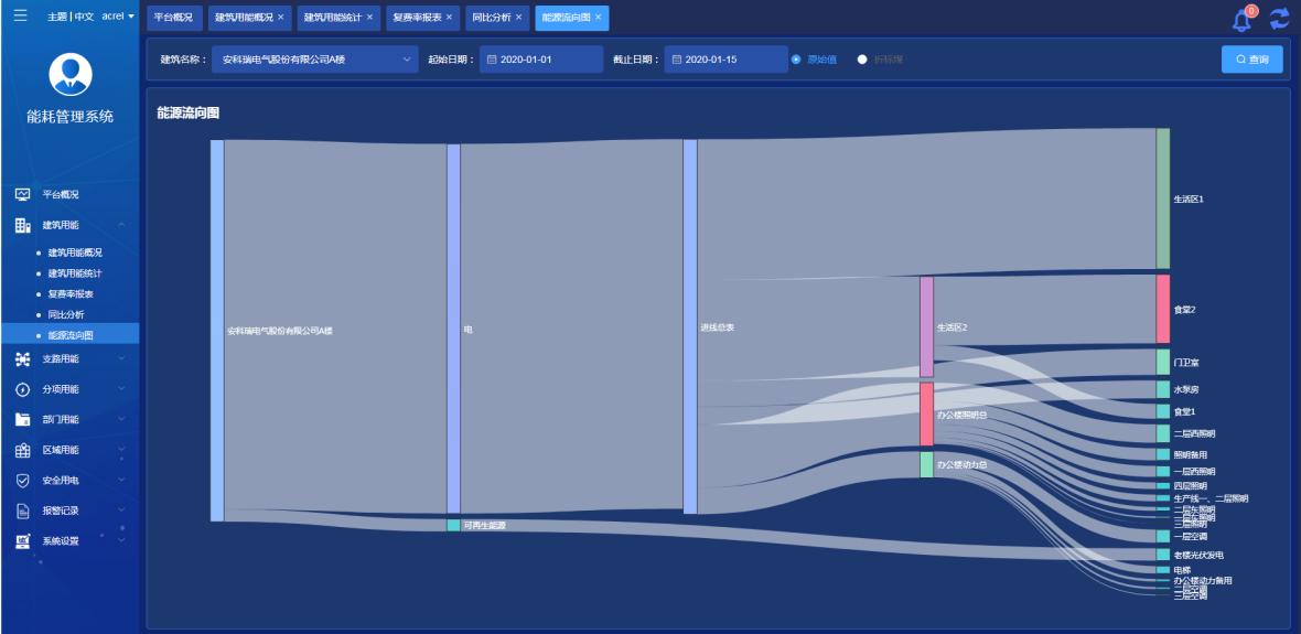 为医院搭建计量体系,显示医院的能源流向和能源损耗,通过能源流向图帮助医院分析能源消耗去向,找出能源消耗异常区域。
