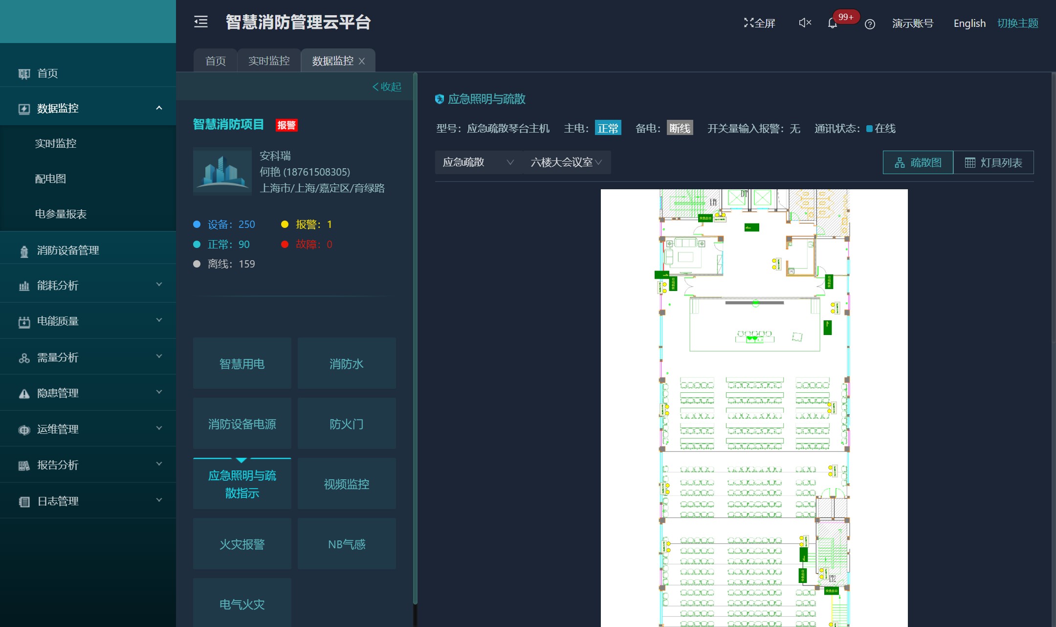 通根据预先设置的应急预案快速启动疏散方案引导人员疏散。系统接入消防应急照明指示系统数据,通过平面图显示疏散指示灯具工作状态和异常情况。